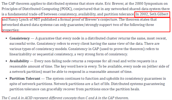 针对CAP理论,查阅了国外的相关文档表述,CAP理论来源于2002年麻省理工学院的Seth Gilbert和Nancy Lynch发表的关于Brewer猜想的正式证明。