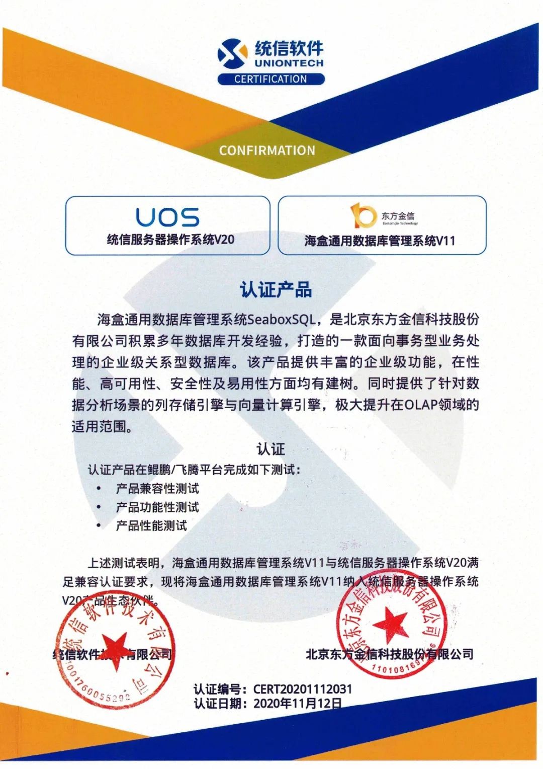 近日,东方金信自主研发的海盒通用数据库管理系统(SeaboxSQL)V11与统信服务器操作系统V20进行了联合测试。
