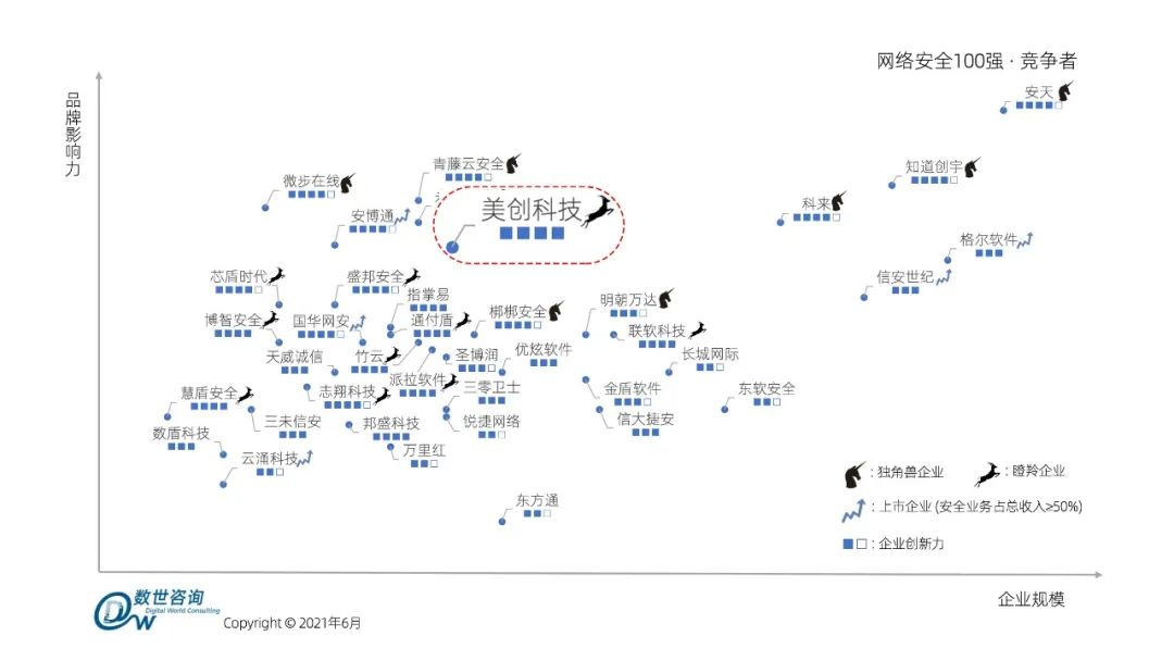 6月16日,国内数字产业第三方调研与咨询机构数世咨询正式发布《中国网络安全百强报告(2021)》(以下简称“百强报告”)。美创科技凭借在数据安全领域领先的技术和服务,成功入选百强企业榜单竞争者点阵,同时入选瞪翎企业。