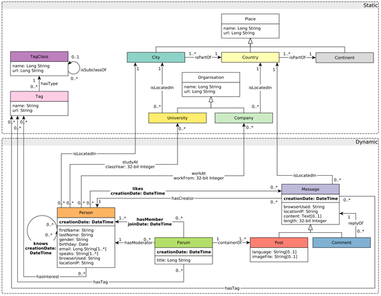 Schema是根据实体及其关系定义benchmark中使用的数据结构。图3.1显示了我们测试中使用的数据模式,包括个人、组织和地点等实体。该模式模拟了人与人之间的互动方式(与其他人建立的朋友关系),模拟了一些内容共享,诸如消息(文本和图像)、对消息的回复、喜欢的消息等。人们还组成小组讨论特定的话题,我们将这些话题用标签来表示。