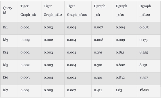 简单交互查询(IS)系列中有7个查询,Dgraph未能完成查询IS2。表5.2给出了在SF-1、SF-10和SF-100数据集上Dgraph和TigerGraph完成剩余6个查询上的响应时间。