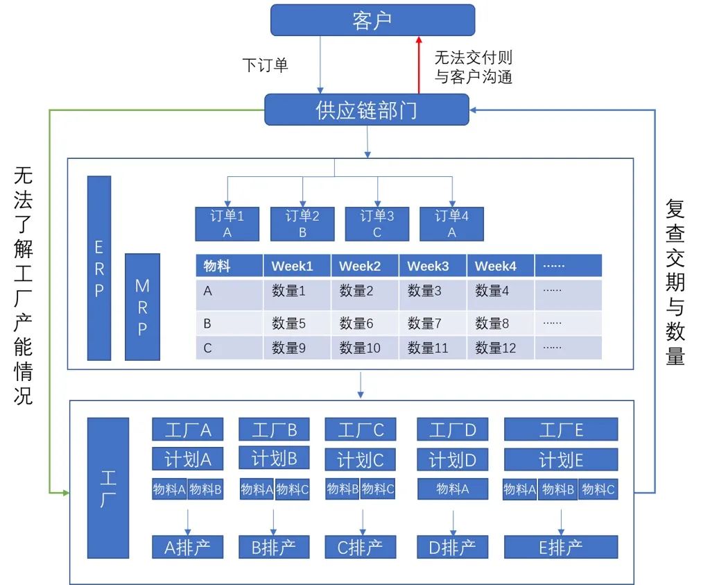 制造企业的市场环境多变又复杂,但因受管理与技术制约,许多信息时常无法及时的获取与传递,导致供应链部门对各个工厂的产能现状不了解,各个工厂排产结果由供应链汇总分配工作量大且繁杂,各个工厂、供应链以及客户间沟通成本大,准时交付率低。