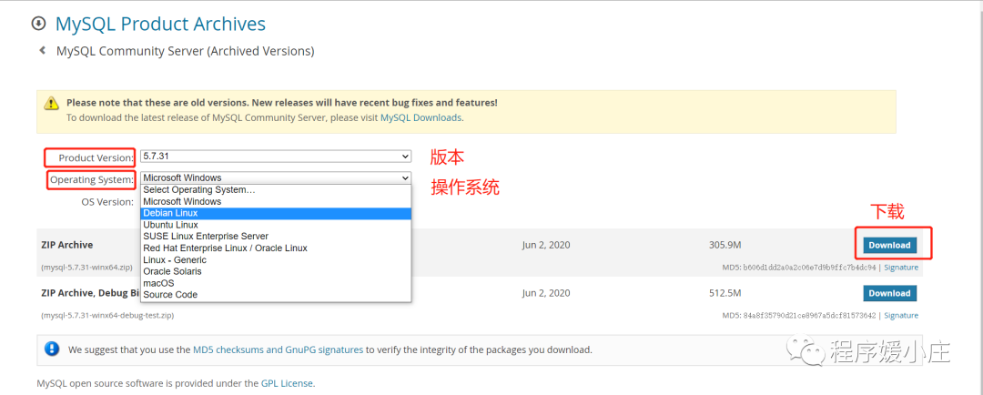 打开下载网址后,选择需要版本(version)和操作系统,由于后期MySQL相关文章是以5.7.31版本为主,因此这里版本选择5.7.31,操作系统根据自己计算机的情况进行下载。