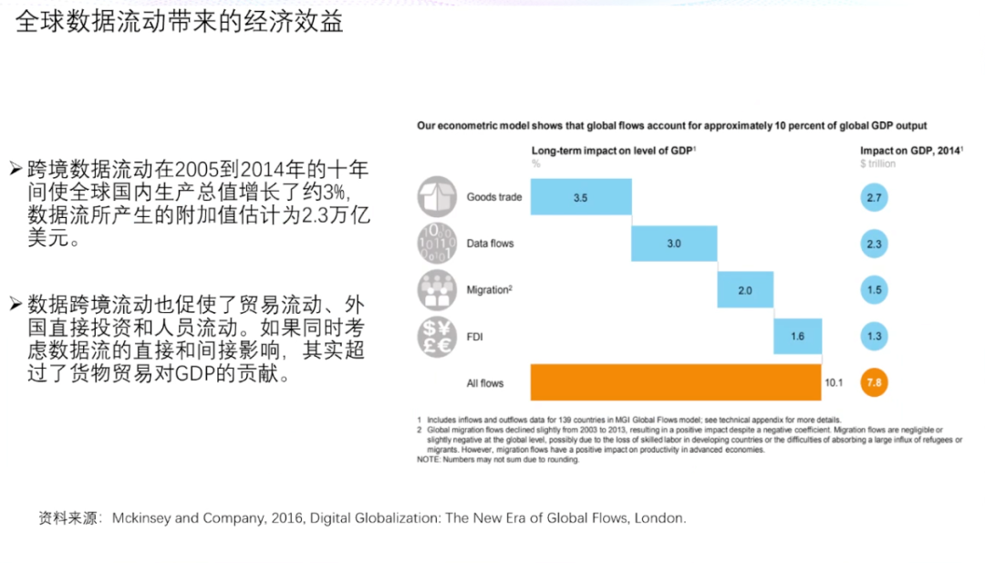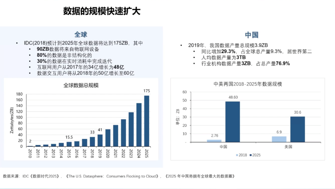 IDC对全球数据规模进行的预测显示,到2025年,全球数据可达175ZB(十万亿亿字节),其中有超过一半(90ZB)来自物联网设备,80%的数据是非结构化的,数据交互用户则将从2018年的50亿上涨到60亿。今天的数据生产速度飞快,规模庞大,数据被机器使用的频率在不断增长。同时数据也使机器更加智能,各种应用都是以数据为起点的,智能化的系统将能够处理更多的数据,所以在智能化时代中数据将优先于应用,走得更快一点。数据是一切的起点,中国又是数据大国,这使得数据运作在中国变得非常重要。中国的数据规模增速飞快。从中美数据比较来看,2018年,中国数据产量总规模为2.76ZB,远不及美国的6.9ZB。然而到2025年中国数据产量规模将达到48.6,放大17倍有余,达到美国的1.5倍。中国的人口、设备量巨大,随之而来的是数据的生产、迭代速度飞快。在今天,中国是数据大国,未来将是更大的数据大国。人工智能是与人类认知平行的机器认知。以数据为基础的机器认知正逐步成为人类认知发展的平行线,人工智能扩大了知识的绝对空间。同时,基于人工智能,数据不仅可以作为知识的载体,还与知识呈一体两面的关系,数据的流通就是知识的流通。而随着大数据和人工智能的快速发展,社会正在离开信息时代,走向智能时代。今天的数据不仅为科学提供创新,也能直接创造财富,数据在流动、运行的过程中,产生了庞大的经济规模。麦肯锡在2016年曾对全球范围内数据与GDP的关系做出分析,在2005年到2014年期间,跨境数据流动使全球GDP增长了约3%,数据流动所产生的附加值约为2.3万亿美元。交易、移民、直接投资等一切贸易行为都与数据相连,最新的统计数据表明,欧盟地区8%的GDP是从数据中产生的。围绕数据产生的经济规模使人们愈发认识到,数据不只是资源,更是资产。当数据以公共资源的形态出现时,就很容易被滥用,以畜牧业为例,公共牧场很容易出现过度放牧的问题,因为没有管理,导致牛羊过度破坏牧场资源,最后势必导致生态恶化,破坏环境。因此,在市场经济原则下,要更好地满足数据技术对数据规模、维度、密度的要求,就必须把数据从「资源」变成「资产」,从而使其承担起应有的经济学功能,推动智能社会更好地运转。
