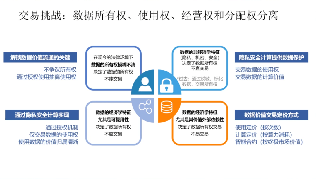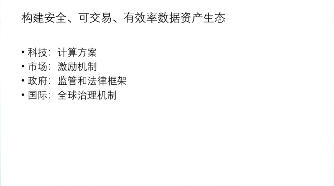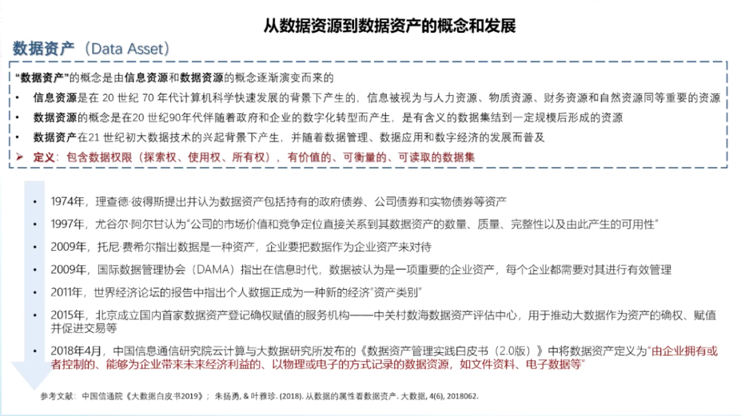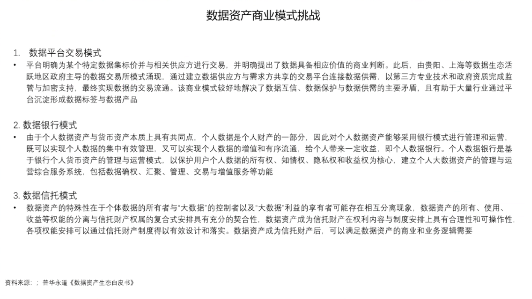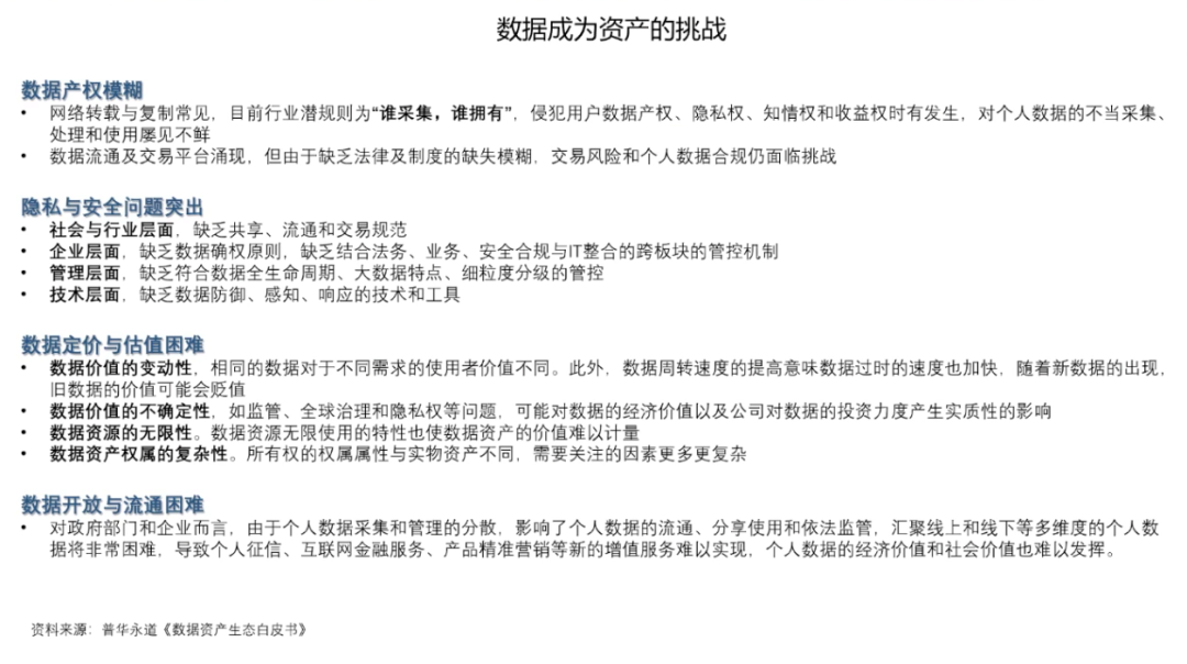 数据资产的概念是由信息资源和数据资源两个概念衍生而来的。数据资产一词诞生于上世纪七十年代,最初被认为是可持有的政府债券、公司债券和实物债券等资产。2011年的世界经济论坛,首次提出了数据成为新的经济「资产类别」。数据的基本特征是质量参差不齐、收集目的不同、非标准化、非结构化和相互隔离。数据有很强的外部依赖性,时效性、应用场景、应用算法、网络效应,这些都会决定数据的结构,数据的存量和数据的价值。数据的生成性是数据资产化的重要特征,数据本身并无价值,只有在被使用时,数据才产生价值。作为「资产」的数据有着一系列独有的特征,包括可交易的资产特点;资源丰富、更新频繁、类别多样等信息价值;准公共物品的有限非排他性和非竞争性;可以流通使用的外部性;数据持续产生原始和衍生数据,不断创造新价值的自然增值属性;数据从产生开始就具备多方面满足人类生存和发展的多维性;零成本无限共享,且集合使用价值高。数据资产化要面临诸多挑战。首先是数据的产权模糊,数据具有可复制性,在今天的互联网中普遍奉行「谁采集谁拥有」的潜规则。由此,侵犯隐私、数据泄露等问题比比皆是。当消费者进行网购时,消费者的数据要流经支付平台、银行、购物平台、商家等多个渠道,那么谁是数据最后的拥有者,这是一个很值得讨论的法律问题。由数据产权问题也引申出了数据的隐私和安全问题,需要从社会与行业层面、企业层面、管理层面、技术层面等多方面共同解决。而针对所有权、隐私与安全方面的考虑也导致了数据的开放与流通困难,数据不流通就会形成孤岛,孤岛就无法达到数据需求的规模和密度,数据的有效性就会大打折扣。此外,数据的定价和估值相对困难,数据的非竞争性和无限共享特性,使数据的潜在应用价值很大,数据具有很长的长尾价值链,价值链的各个环节需求不同,可以从数据中挖掘到价值也各有不同,这就使得数据价值具有很大的不确定性。因此数据资产需要建立动态的定价机制。第一,解决隐私安全计算方面的技术问题。通过多方安全计算MPC/同态加密、联邦学习/FDL和安全筛箱计算/TEE等技术手段保护数据的隐私安全。第二,建立交易机制。数据交易过程中最大的问题在于数据权属难以界定。今天的法律对数据所有权的界定是模糊的,这直接导致了数据交易困难,而数据的可复制性又使得数据所有权无需交易。在这种情况下,要完成数据交易,并满足多方利益需求,就要对数据的所有权、使用权、经营权和分配权进行分离。在权属分配方面,中国过去的土地所有制改革经验十分值得借鉴,土地承包制度把土地的所有权、使用权、经营权和分配权一步步分离开,在随后的生产中产生了重大社会效益和经济效益。如果数据也能够在分离的基础上,明确使用权的归属、经营权的归属和分配权的归属,并由此建立生态,则可以有效加速数据资产化,提高数据应用的效率。第三,数据资产金融化,即为数据赋予价值。数据在应用之前,需要先进行场景拆分、清洗、标注等一系列工作,因此数据的生产成本很高。而数据的价值链非常长,且随着数据被反复使用,不断集成,其本身的价值也会持续增大,数据的价值是一个动态发展的过程。由此,数据资产的起点是高成本,终点是长期回报。数据价值很难用成本法来计算,而以收益法计算则要考虑权利金的节约、超额收益和增量收益等多重因素。以市场法估算数据价值需要每一个所有者、经营者、使用者和分配者都在其中公平地分享的一个权重,共同投资数据,共同分享长期收益。第四,建立数据资产等商业模式。目前来看,数据资产有三种可行的商业模式数据平台交易模式、数据银行模式和数据信托模式。目前,数据平台交易模式在贵阳、上海等数据生态活跃地区,已经由政府主导建立了一些平台,数据平台通过第三方和政府资质完成监管与加密,较好地解决了数据互信、数据保护和数据供需的主要矛盾,且有助于大量行业通过平台沉淀形成数据标签与数据产品。数据银行的理念则是将数据存储在像银行一样的机构中,并由「银行」对数据进行加工、隐私安全处理,以保护用户个人数据的所有权、知情权、隐私权和收益权为核心,建立个人大数据资产的管理与运营综合服务系统,包括数据确权、汇聚、管理、交易与增值服务等功能。数据信托是业内热议的全新数据商业理念,数据资产的所有、使用、收益等权属的分离与信托财产权属的复合式安排具有充分的契合性,数据资产成为信托财产在权利内容与制度安排上具有合理性和可操作性,各项权能安排可以通过信托财产制度得以有效设计和落实,数据资产成为信托财产后,可以满足数据资产的商业和业务逻辑需要。目前,全球的数据流动监管主要以鼓励国内数据共享,约束跨境数据流动为框架。