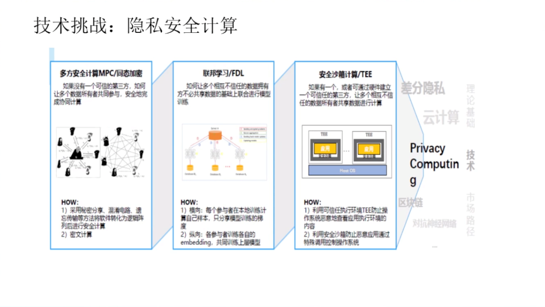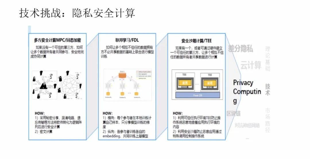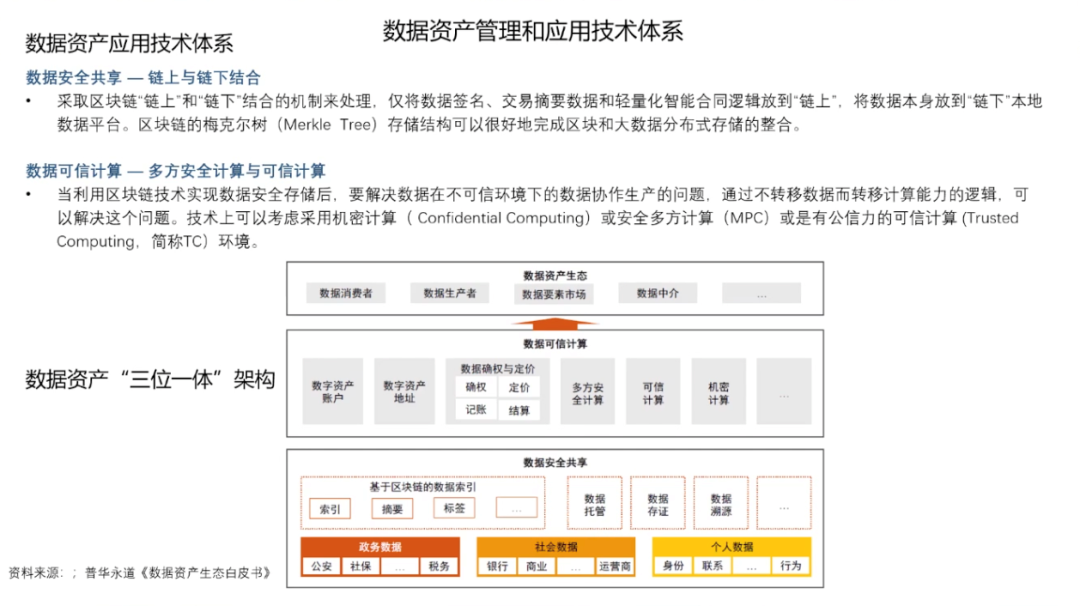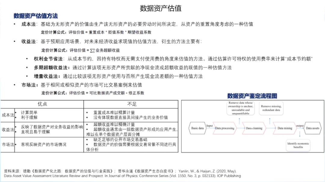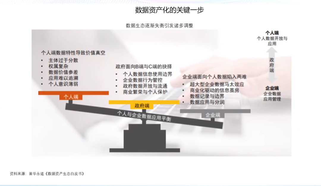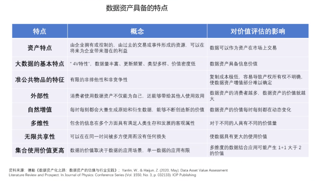 数据资产的概念是由信息资源和数据资源两个概念衍生而来的。数据资产一词诞生于上世纪七十年代,最初被认为是可持有的政府债券、公司债券和实物债券等资产。2011年的世界经济论坛,首次提出了数据成为新的经济「资产类别」。数据的基本特征是质量参差不齐、收集目的不同、非标准化、非结构化和相互隔离。数据有很强的外部依赖性,时效性、应用场景、应用算法、网络效应,这些都会决定数据的结构,数据的存量和数据的价值。数据的生成性是数据资产化的重要特征,数据本身并无价值,只有在被使用时,数据才产生价值。作为「资产」的数据有着一系列独有的特征,包括可交易的资产特点;资源丰富、更新频繁、类别多样等信息价值;准公共物品的有限非排他性和非竞争性;可以流通使用的外部性;数据持续产生原始和衍生数据,不断创造新价值的自然增值属性;数据从产生开始就具备多方面满足人类生存和发展的多维性;零成本无限共享,且集合使用价值高。数据资产化要面临诸多挑战。首先是数据的产权模糊,数据具有可复制性,在今天的互联网中普遍奉行「谁采集谁拥有」的潜规则。由此,侵犯隐私、数据泄露等问题比比皆是。当消费者进行网购时,消费者的数据要流经支付平台、银行、购物平台、商家等多个渠道,那么谁是数据最后的拥有者,这是一个很值得讨论的法律问题。由数据产权问题也引申出了数据的隐私和安全问题,需要从社会与行业层面、企业层面、管理层面、技术层面等多方面共同解决。而针对所有权、隐私与安全方面的考虑也导致了数据的开放与流通困难,数据不流通就会形成孤岛,孤岛就无法达到数据需求的规模和密度,数据的有效性就会大打折扣。此外,数据的定价和估值相对困难,数据的非竞争性和无限共享特性,使数据的潜在应用价值很大,数据具有很长的长尾价值链,价值链的各个环节需求不同,可以从数据中挖掘到价值也各有不同,这就使得数据价值具有很大的不确定性。因此数据资产需要建立动态的定价机制。第一,解决隐私安全计算方面的技术问题。通过多方安全计算MPC/同态加密、联邦学习/FDL和安全筛箱计算/TEE等技术手段保护数据的隐私安全。第二,建立交易机制。数据交易过程中最大的问题在于数据权属难以界定。今天的法律对数据所有权的界定是模糊的,这直接导致了数据交易困难,而数据的可复制性又使得数据所有权无需交易。在这种情况下,要完成数据交易,并满足多方利益需求,就要对数据的所有权、使用权、经营权和分配权进行分离。在权属分配方面,中国过去的土地所有制改革经验十分值得借鉴,土地承包制度把土地的所有权、使用权、经营权和分配权一步步分离开,在随后的生产中产生了重大社会效益和经济效益。如果数据也能够在分离的基础上,明确使用权的归属、经营权的归属和分配权的归属,并由此建立生态,则可以有效加速数据资产化,提高数据应用的效率。第三,数据资产金融化,即为数据赋予价值。数据在应用之前,需要先进行场景拆分、清洗、标注等一系列工作,因此数据的生产成本很高。而数据的价值链非常长,且随着数据被反复使用,不断集成,其本身的价值也会持续增大,数据的价值是一个动态发展的过程。由此,数据资产的起点是高成本,终点是长期回报。数据价值很难用成本法来计算,而以收益法计算则要考虑权利金的节约、超额收益和增量收益等多重因素。以市场法估算数据价值需要每一个所有者、经营者、使用者和分配者都在其中公平地分享的一个权重,共同投资数据,共同分享长期收益。第四,建立数据资产等商业模式。目前来看,数据资产有三种可行的商业模式数据平台交易模式、数据银行模式和数据信托模式。目前,数据平台交易模式在贵阳、上海等数据生态活跃地区,已经由政府主导建立了一些平台,数据平台通过第三方和政府资质完成监管与加密,较好地解决了数据互信、数据保护和数据供需的主要矛盾,且有助于大量行业通过平台沉淀形成数据标签与数据产品。数据银行的理念则是将数据存储在像银行一样的机构中,并由「银行」对数据进行加工、隐私安全处理,以保护用户个人数据的所有权、知情权、隐私权和收益权为核心,建立个人大数据资产的管理与运营综合服务系统,包括数据确权、汇聚、管理、交易与增值服务等功能。数据信托是业内热议的全新数据商业理念,数据资产的所有、使用、收益等权属的分离与信托财产权属的复合式安排具有充分的契合性,数据资产成为信托财产在权利内容与制度安排上具有合理性和可操作性,各项权能安排可以通过信托财产制度得以有效设计和落实,数据资产成为信托财产后,可以满足数据资产的商业和业务逻辑需要。目前,全球的数据流动监管主要以鼓励国内数据共享,约束跨境数据流动为框架。