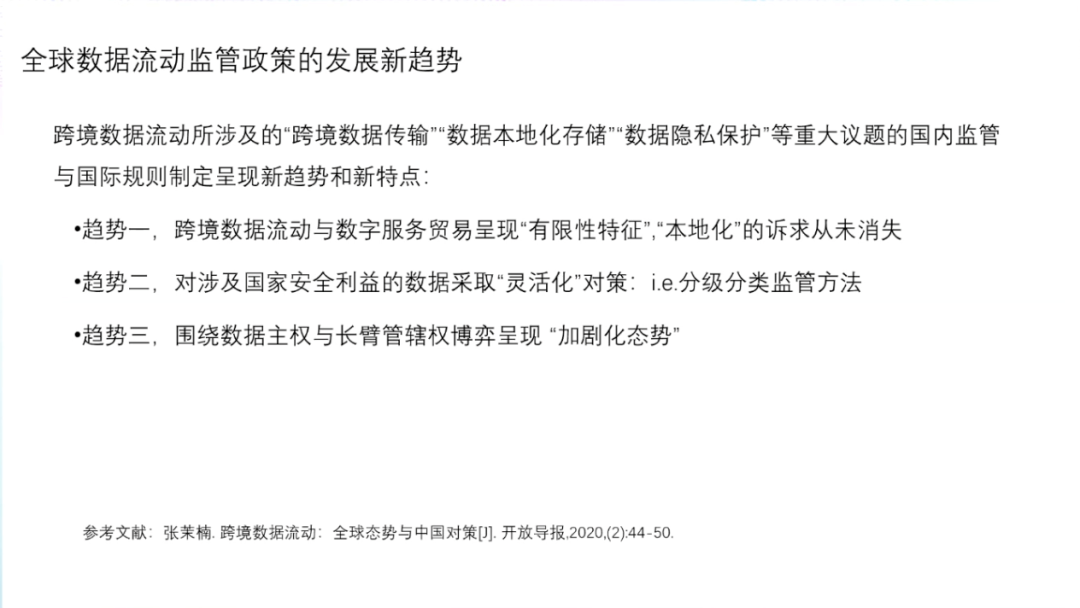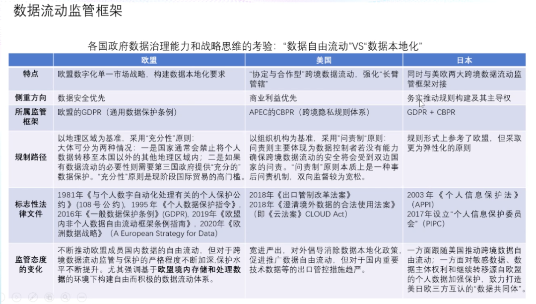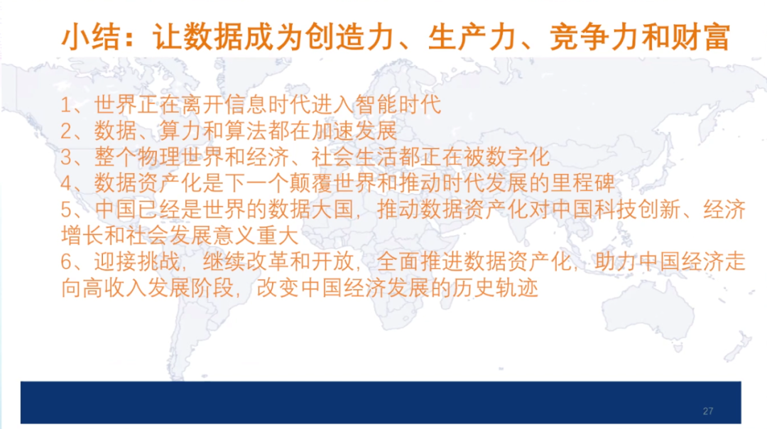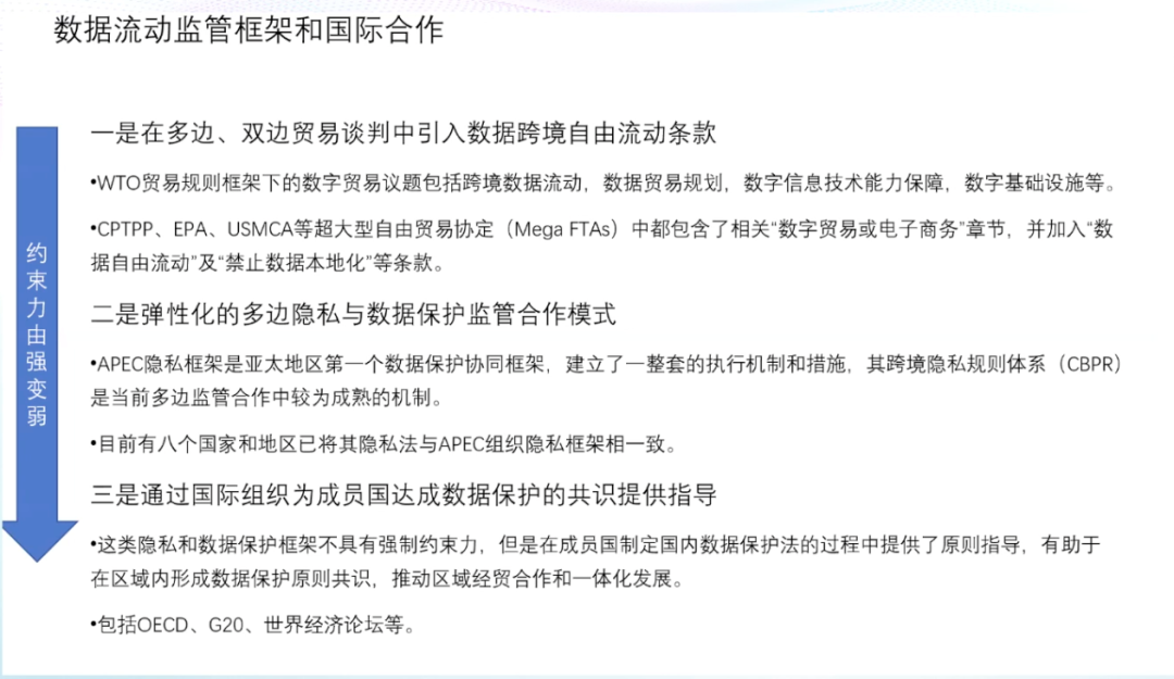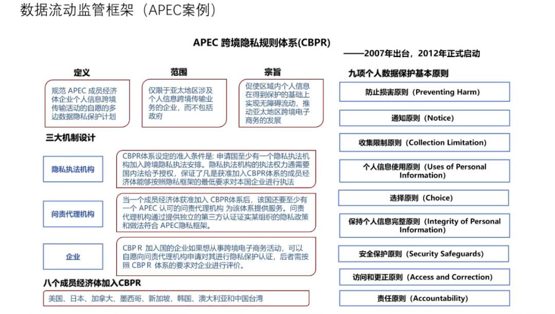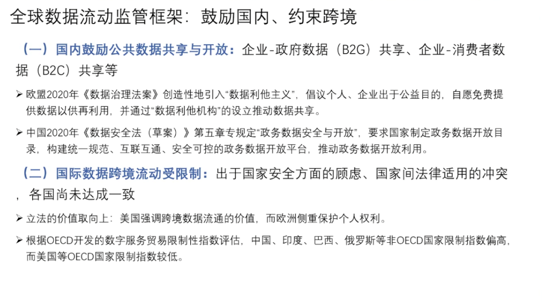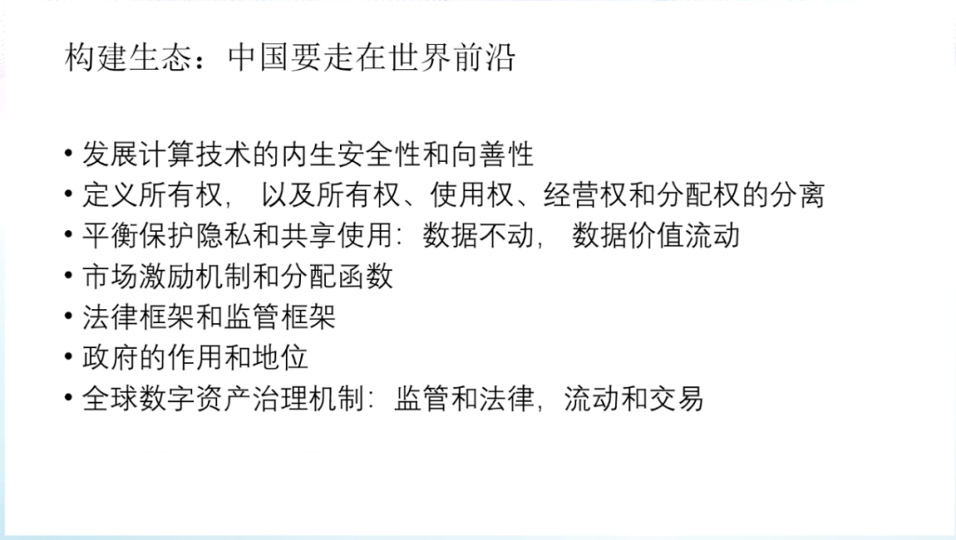 在数据的内部共享方面,2020年欧盟的《数据治理法案》引入了「数据利他主义」,倡议个人、企业出于公益目的,自愿免费提供数据,并通过「数据利他机构」等设立推动数据共享。中国在2020年推出的《数据安全法(草案)》中要求国家制定政务数据开放目录,构建统一规范、互联互通、安全可控的政务数据开放平台,推动政务数据开放利用。而在国家之间,由于国家安全、国家间法律冲突等问题,各国尚未就数据流动达成一致。在立法取向上,美国强调跨境数据流通价值,欧盟则倾向于保护个人权利。以2012年APEC正式启动的跨境隐私规则体系(CBPR)为例。在数据流动监管框架中提出了九项个人数据保护基本原则,包括:防止损害、通知原则、收集限制、个人信息使用原则、选择原则、保护个人信息完整、安全保护原则、访问和更正原则以及责任原则。在九项基本原则之上,APEC设立了隐私执法机构、问责代理机构进行监管,并接受成员国企业申请隐私保护认证。中国经济正在全面走向数字经济,经济的驱动力正在发生着根本的变化。2020年的疫情提出了无接触的概念,也拉动了中国的数字经济转型。在疫情以前,中国经济是以地产、能源和传统基建驱动的资源型经济。疫情后,中国的经济的驱动力开始逐渐向以数字经济和新基建为主的数据驱动过度,并逐步开启了新的无接触经济,并以自主创新的形式在全球价值链中重新定位。数据资产化的关键在于个人与企业数据应用的平衡,在个人端,主体过于分散、权属复杂、数据价值参差、应用难以追溯、个人意识薄弱等特性,导致个人端数据价值真空。在企业端则会出现,超大型企业数据的马太效应、商业化驱动这个信息的茧房、数据记录与边界等问题。在这个过程中,政府可以起到非常重要的作用,包括明确个人数据信息的使用边界、企业数据行为管控、政府数据开放与流通、商业繁荣与个人保护等。中国要在数据技术和商业模式方面走在世界前沿,就必须要抓紧构建数据资产生态。发展计算技术的内生安全性和向善性;定义所有权,以及所有权、使用权、经营权和分配权的分离;平衡保护隐私和共享使用,数据不动,数据价值流动;建立市场激励机制和分配函数;完善法律框架和监管框架;明确政府的作用和地位;协调全球数字资产治理机制:监管和法律,流动和交易。世界正在离开信息时代进入智能时代。数据、算力和算法都在加速发展,整个物理世界和经济、社会生活都正在被数字化,数据资产化将是下一个颠覆世界和推动时代发展的里程碑。中国已经是世界的数据大国,推动数据资产化对中国科技创新、经济增长和社会发展意义重大。迎接挑战,继续改革开放,全面推进数据资产化,助力中国经济走向高收入发展阶段,改变中国经济发展的历史轨迹。下附朱民博士演讲PPT供参考