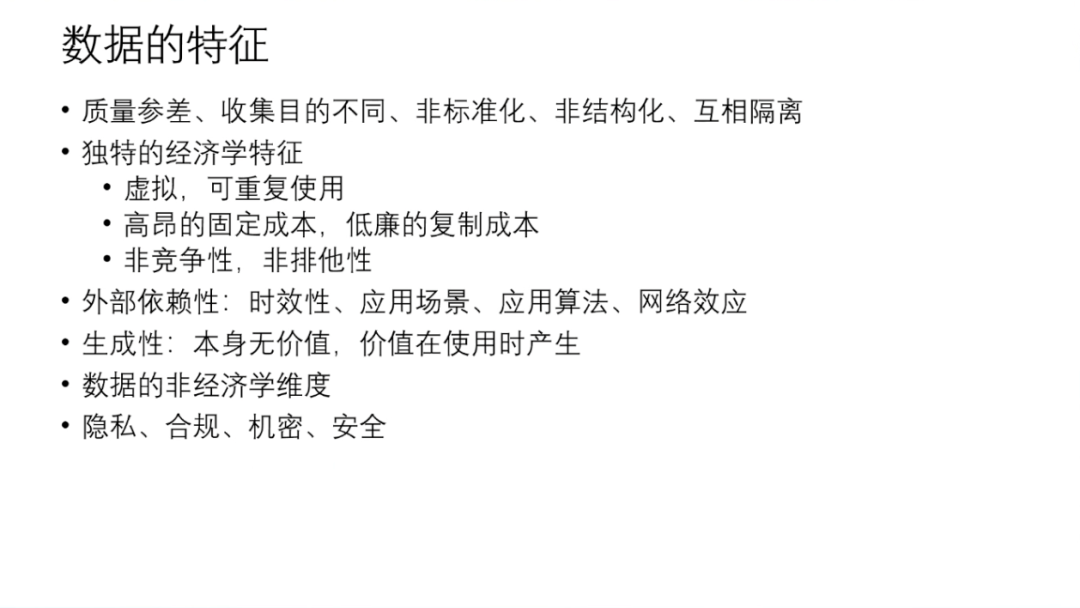 数据在今天的社会中无处不在,随着数据规模的扩大,数据应用的加深,人们开始愈发重视数据的经济学特征。数据的虚拟特性,使其可重复使用,且转移成本为零;数据有高昂的固定成本,且复制成本几乎为零;数据可以共享,即具有非竞争性和非排他性。这三个特征,在经济学意义上为数据创造了很大的想象空间。