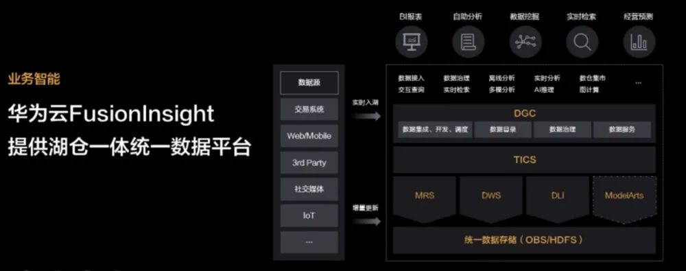 华为云 FusionInsight 智能数据湖提供湖仓一体的数据底座,Serverless 数据湖探索 DLI、统一数据平台 MRS、数据仓库 DWS、数据湖治理中心 DGC、可信智能计算云服务 TICS 等都包含其中。通过底层 OBS 统一数据存储,全局一份数据无需搬迁;一个平台多引擎支持批处理、流处理、交互式查询等;元数据统一管理,全局一个视图,像管理代码一样管理数据。