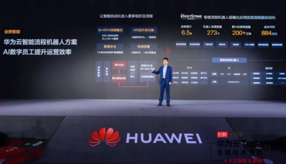 为了给企业应用 AI 技术插上“翅膀”,华为云近两年持续升级一站式 AI 开发平台 ModelArts,提出了“知识计算”,又于今年 4 月发布了霸榜 CLUE 榜单的盘古预训练模型。本次,华为云发布了智能流程机器人解决方案,将机器人流程自动化(RPA)与人工智能(AI)相结合,可以实现包含财务、税务、IT、商务、采购、HR、项目管理、薪酬管理等在内的复杂业务流程的自动化,最终帮助企业打造“AI 数字员工”。