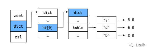 除此之外, zset 结构中的 dict 字典为有序集合创建了一个从成员到分值的映射, 其中字典的键保存了元素的成员, 而字典的值则保存了元素的分值。