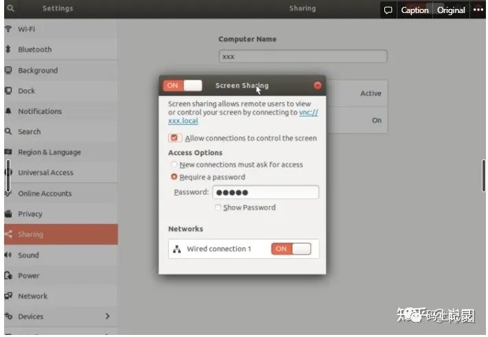 如果没有共享桌面的设置选项,那么很可能是安装ubuntu20.04时选择的最小化安装。这种情况下, 需要安装vino 用于设置共享桌面。