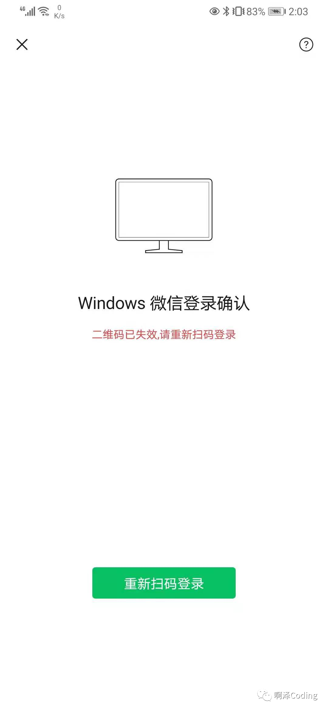 第 6 步的绑定身份信息不包括密码等信息。只是简单的一些对外的信息,比如头像,昵称等。 上图中还有一些状态信息没画出来,比如 PC 端对二维码的定期更新(二维码有过期时间),如果 PC 端显示的二维码长时间未被扫描,则会出现如下情况: