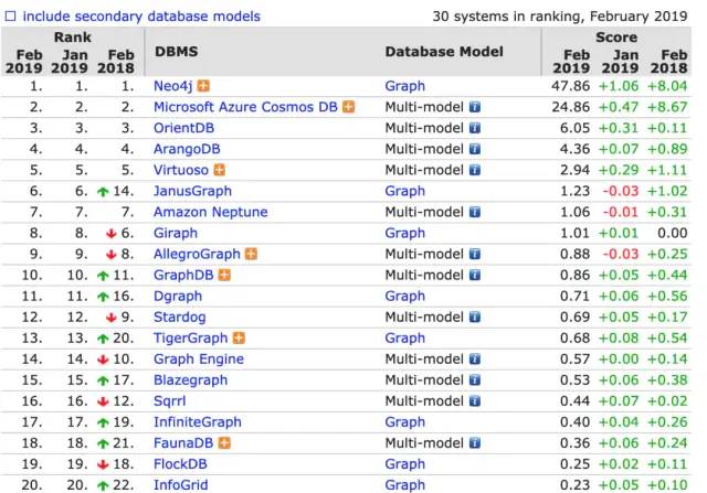 根据DB-Engines最新发布的图数据库排名,Neo4J仍然大幅领先排在第一位: