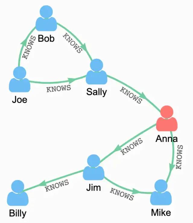 Joe认识Sally,Sally认识Anna。Bob被排除在结果之外,因为除了通过Sally成为二级朋友之外,他还是一级朋友。