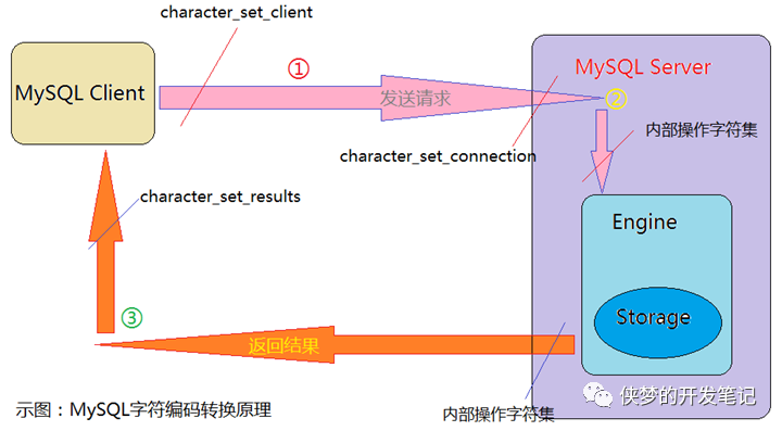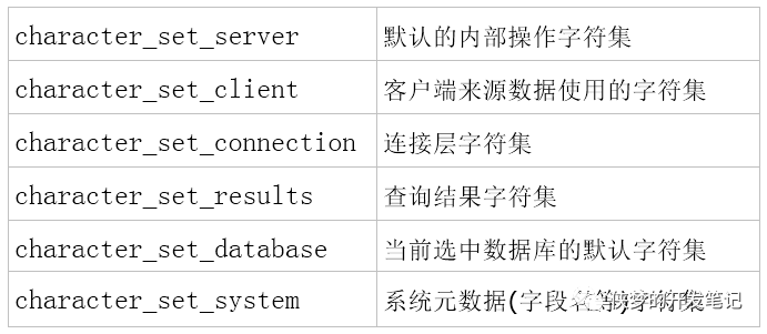 更新流程字符集转换过程:character_set_client-->character_set_connection-->表字符集。查询流程字符集转换过程:表字符集-->character_set_result当前默认数据库的字符集,比如执行use xxx后,当前数据库变为xxx,若xxx的字符集为utf8,那么此变量值就变为utf8(供系统设置,无需人工设置)。 客户端使用的字符集必须通过character_set_client、character_set_connection体现出来: ①在客户端对数据进行编码(Linux:utf8、windows:gbk) ②MySQL接到SQL语句后(比如insert),发现有字符,询问客户端通过什么方式对字符编码:客户端通过character_set_client参数告知MySQL客户端的编码方式(所以此参数需要正确反映客户端对应的编码) ③当MySQL发现客户端的client所传输的字符集与自己的connection不一样时,会将client的字符集转换为connection的字符集 ④MySQL将转换后的编码存储到MySQL表的列上,在存储的时候再判断编码是否与内部存储字符集(按照优先级判断字符集类型)上的编码一致,如果不一致需要再次转换 客户端使用的字符集必须通过character_set_results来体现,服务器询问客户端字符集,通过character_set_results将结果转换为与客户端相同的字符集传递给客户端。(character_set_results默认等于character_set_client)问:若character_set_client为UTF8,而character_set_database为GBK,则会出现需要进行编码转换的情况,字符集转换的原理是什么?