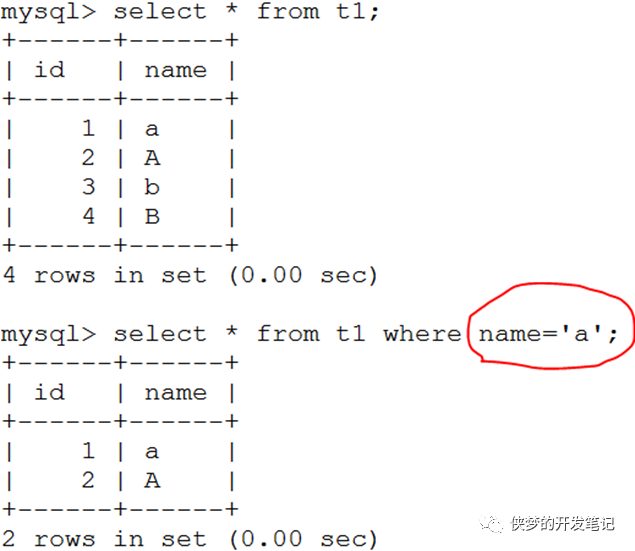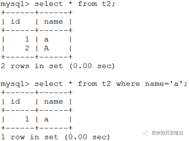 ③存在校对规则命名约定:以其相关的字符集名开始,中间包括一个语言名,并且以_ci(大小写不敏感)、_cs(大小写敏感)或_bin(二元)结束。 系统使用utf8字符集,若使用utf8_bin校对规则执行SQL查询时区分大小写,使用utf8_general_ci不区分大小写(默认的utf8字符集对应的校对规则是utf8_general_ci)。mysql> create table t2(id int,name varchar(20)) character set=gbk collate=gbk_bin; #t2建表指定校对规则(区分大小写)