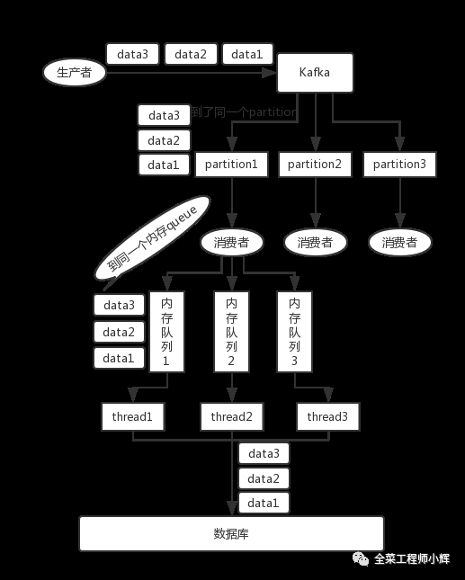 如下图所示,在不增加partition数量的情况下想提高消费速度,可以考虑再次hash唯一标识(例如订单orderId)到不同的线程上,多个消费者线程并发处理消息(依旧可以保证局部有序)。
