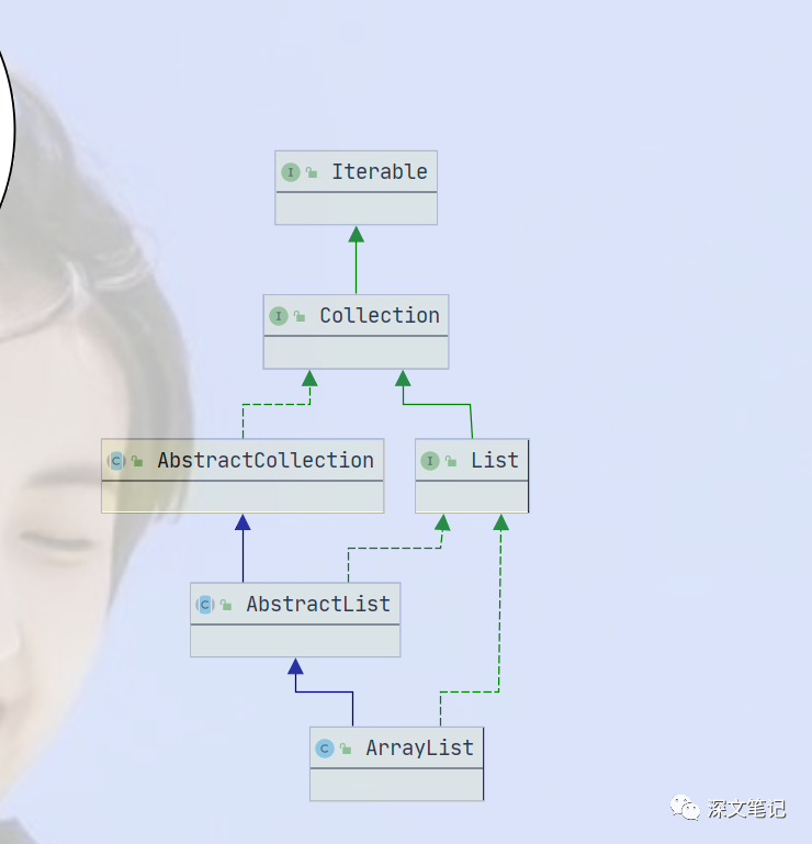 先来看下ArrayList的上级,可以看到最上面有一个迭代器,这个是不是想到了有一种设计模式叫迭代器设计模式?