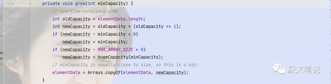 先将 elementData的数组长度扩大1.5倍,然后与 minCapacity和MAX_ARRAY_SIZE进行比较,最后得出 newCapacity的值来.