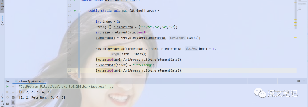 比如我现在集合有十个元素? 我往第五个插入一个字符串的值是: "PeterWong", 那我是不是将从第五开始后的元素都往后移动一位呢?但是这里并没有发现往后移动赋值的for循环代码呀?那是因为 System.arrraycopy 给我们做了一件这样的事情. 看下图的结果,可以看到System.copyof是将index的值给复制了一份,然后ArrayList再调用 elementData[index] = element给覆盖掉了. 所以我们没有看到for循环去移动值,是因为 System.copyof帮我们做了.
