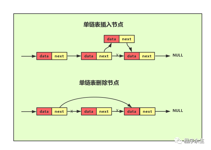 单链表中每个节点除了包含数据之外还包含一个指针,叫后继指针,因此需要额外的空间来存储后继节点的地址。有两个特殊的节点,头结点和尾节点,其中头节点用来记录链表的基地址,有了它就可以遍历整个链表,尾节点的后继指针不是指向下一个节点,而是指向一个空地址NULL表示这是链表上最后一个节点。与数组一样,单链表也支持数据的查找、插入和删除操作,其中插入和删除操作只需要考虑相邻节点指针的变化,因此为常数级时间复杂度O(1)。要想随机访问第 k 个元素,就没有数组那么高效了。因为链表中的数据并非连续存储的,所以无法像数组那样,根据首地址和下标,通过寻址公式就能直接计算出对应的内存地址,而是需要根据指针一个结点一个结点地依次遍历,直到找到相应的结点,因此时间复杂度为O(N)。
