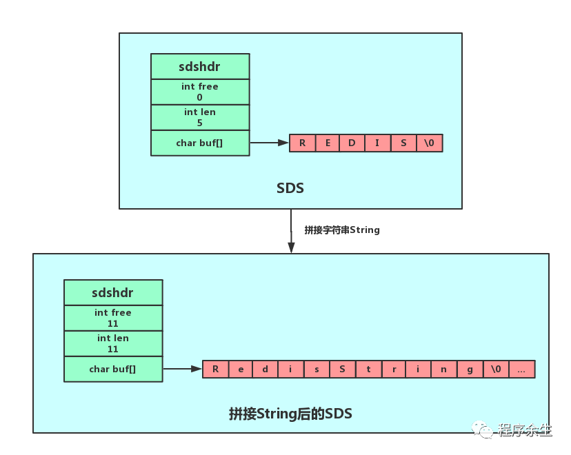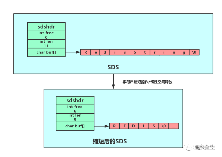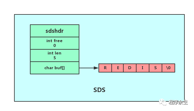 struct sdshdr{ //int 记录buf数组中未使用字节的数量 如上图free为0代表未使用字节的数量为0
