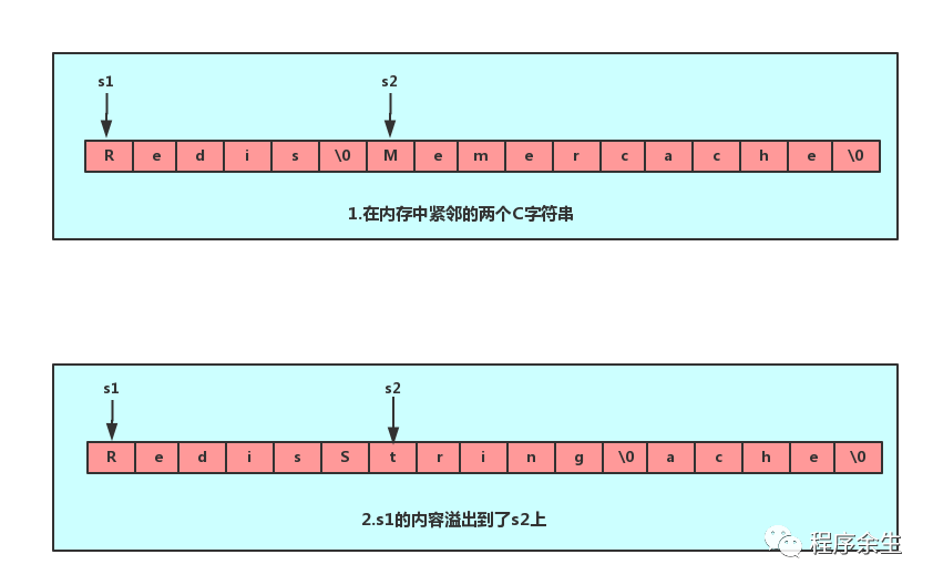 C字符串,如果程序员在字符串修改的时候如果忘记给字符串重新分配足够的空间,那么就会发生内存溢出,如上图所示,忘记给s1分配足够的内存空间, s1的数据就会溢出到s2的空间, 导致s2的内容被修改.。而Redis提供的SDS其内置的空间分配策略则可以完全杜绝这种事情的发生。当API需要对SDS进行修改时, API会首先会检查SDS的空间是否满足条件, 如果不满足, API会自动对它动态扩展, 然后再进行修改。