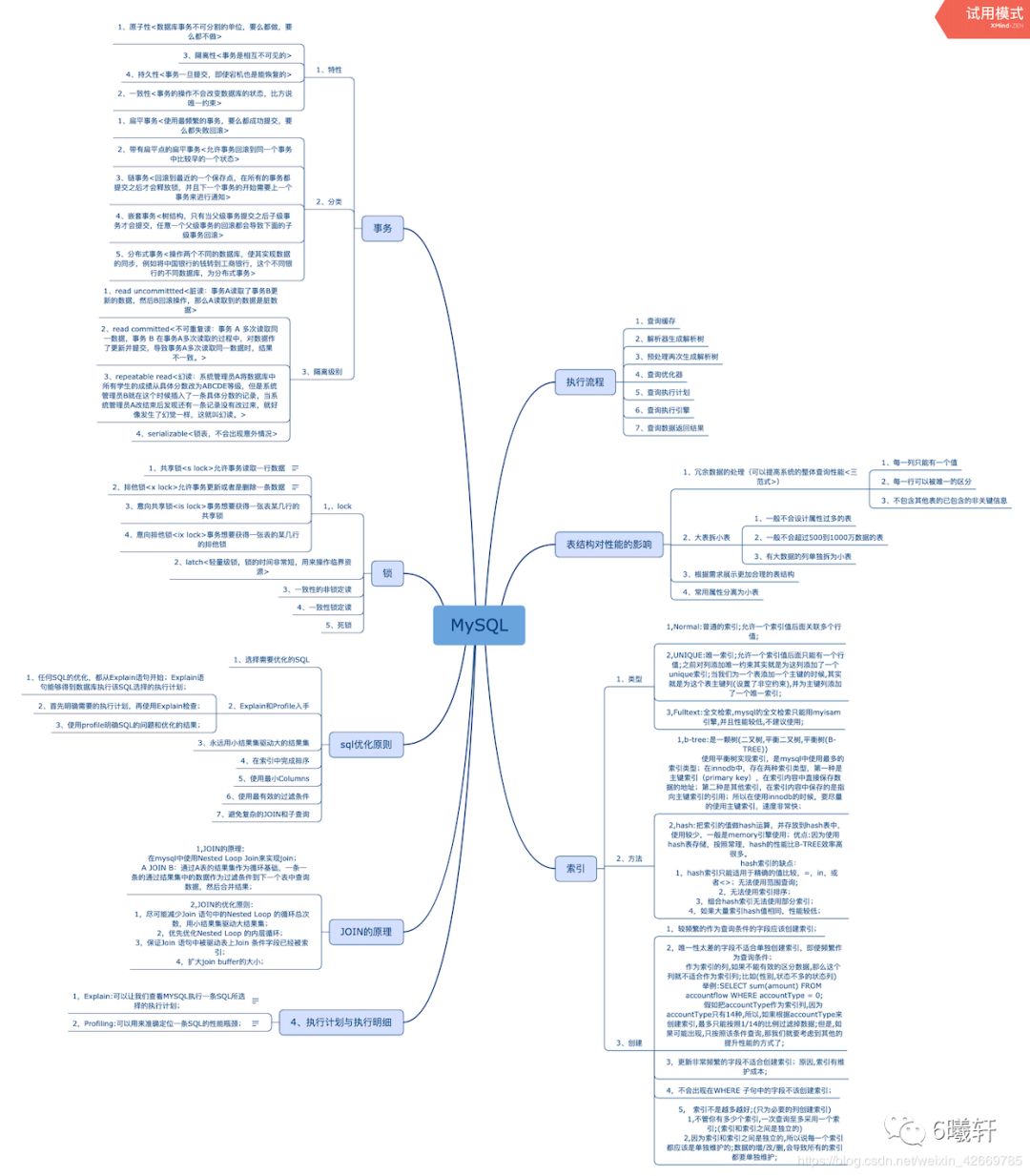 前面提到的脑图如下,想要完整高清图片可以到微信我的公众号下【6曦轩】下回复 MySQL 脑图获取: