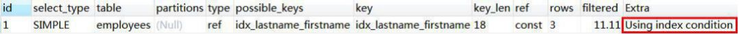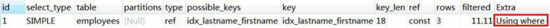 Using Where 代表从存储引擎取回的数据不全部满足条件,需要在 Server 层过滤。先用 last_name 条件进行索引范围扫描,读取数据表记录,然后进行比较,检查是否符合 first_name LIKE ‘%zi’ 的条件。此时 3 条中只有 1 条符合条件。