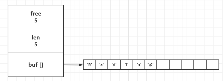 这个 SDS 结构为字符串 'Redis' 分配了5字节的已使用长度,也为其分配了5字节的可用空间长度。