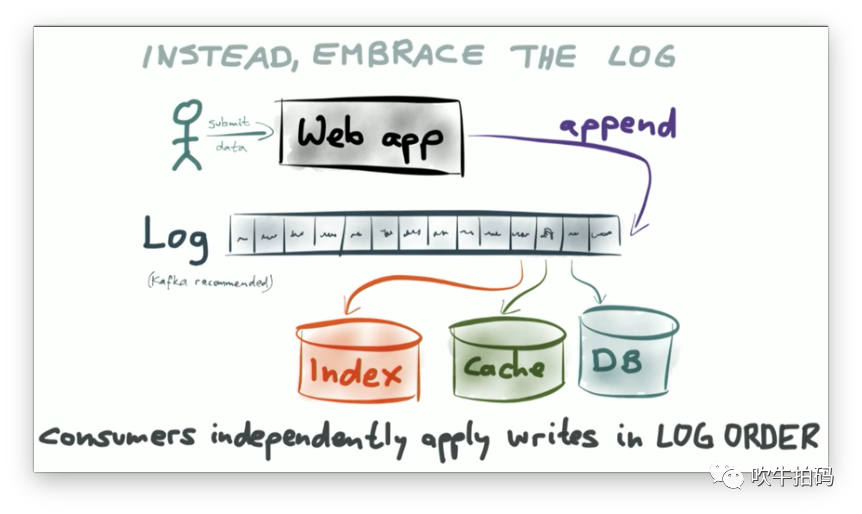 事件流(event stream)提供了一种新的思路:以Kafka为例,应用server将操作以事件的方式追加log到消息队列中,待修改的DB, Cache和Index分别在不同的消费组内消费相同的event log。如果在消费过程中,其中某一个进程crash了,则等待进程重启后,从最后一次消费的offset处继续消费就可以了。