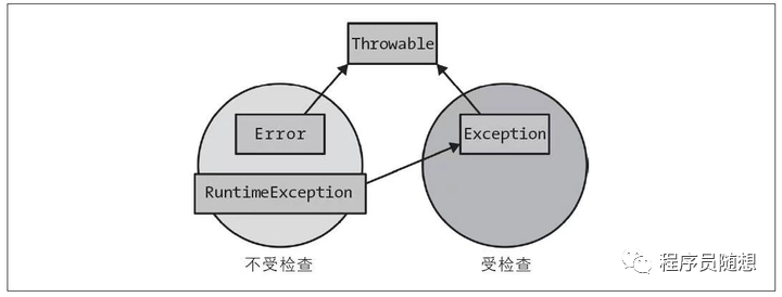 Java异常类是由定义良好的层次结构组成的。Error和RuntimeException是不受检查的异常,它们都是Throwable的子类。你不应该指望捕获它们并从中恢复过来。Exception类通常表示程序应该能从中恢复错误。(如下图)