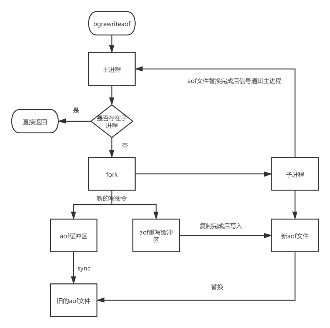 1.手动或者自动触发文件重写后主进程需要先判断当前是否有子进程存在,如果存在则直接返回,不存在则fork子进程;2.fork操作完成后,主进程即可响应其他命令,在子进程生成新的aof文件过程中,主进程仍然维持原来的流程以保证原有aof机制的正确性;3.在子进程生成新的aof文件过程中主进程执行的新命令同时会被写入到aof重写缓冲区中,当新aof文件生成后再将这一部分命令写入到新aof文件中,防止数据丢失;4.子进程根据内存快照,根据重写规则生成新的aof文件,每次批量写入硬盘数据量由配置aof-rewrite-incremental-fsync
