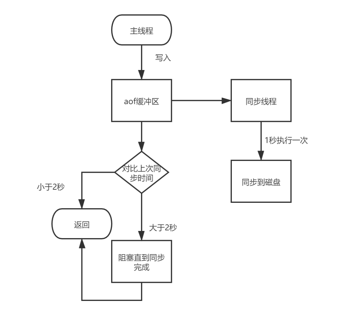 everysec:表示命令写入aof缓冲区后调用操作系统write操作,write操作完成后主线程返回,由专门的线程每秒去进行fsync同步文件操作