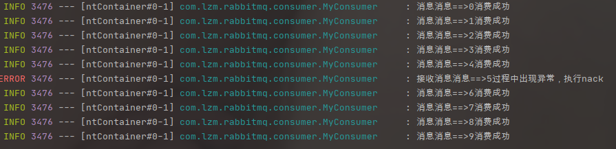 当消息中包含5时抛出异常,执行nack,其他消息都执行ack,生产者发送0-9共10条消息,执行结果如下: