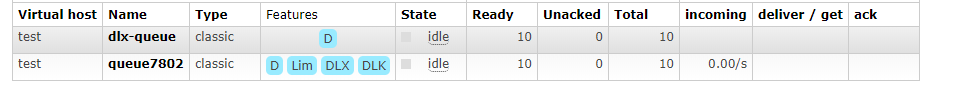 可以看到业务队列和死信队列各有10条数据,也就是说队列中的消息数量超过设置的最大数量时,消息会进入死信队列