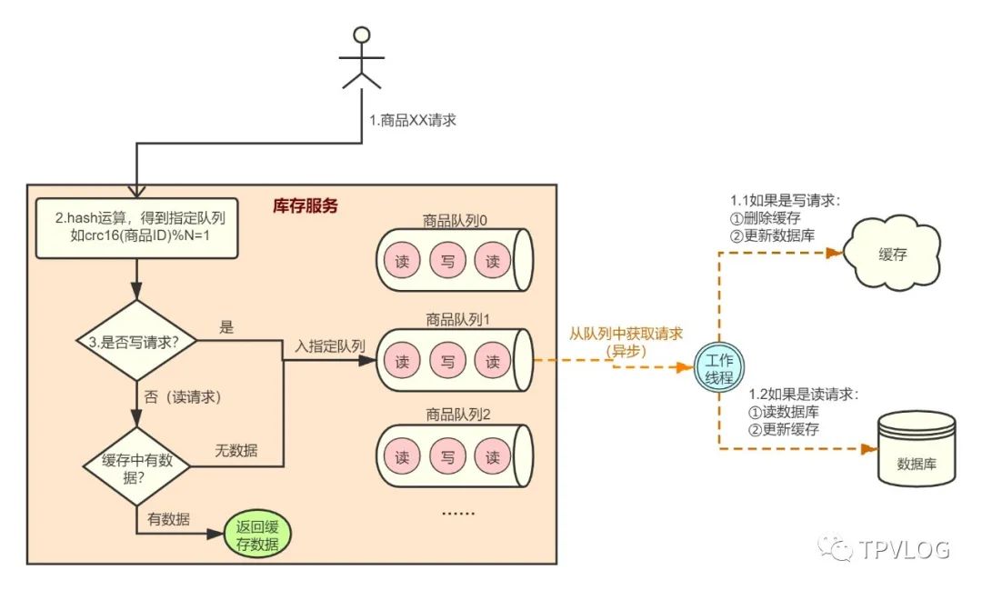 用内存队列保存同一商品的库存读写请求,每个处理线程关联一个内存队列;