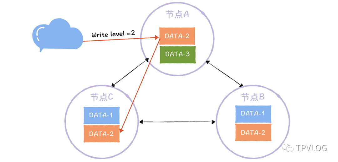 以下图中的DATA-2为例,当它的W=2时,如果客户端对 DATA-2 执行写操作,必须完成它的2 个副本的更新,才算完成了写操作: