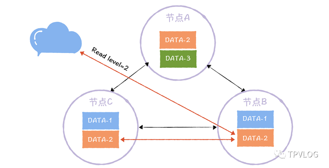 以下图中的DATA-2为例,当它的R=2时,如果客户端读取DATA-2的数据,需要读取它的2 个副本中的数据,然后返回最新的那份数据: