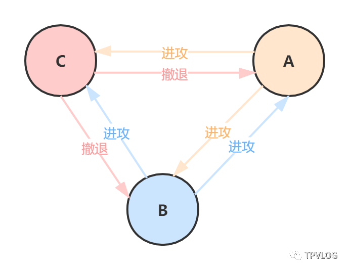 在没有叛徒和间谍干扰的情况下非常简单,比如将军A和B决定进攻,C决定撤退: