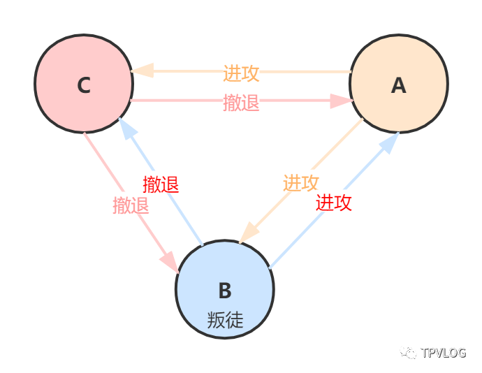 可是,问题来了:一旦有人在暗通敌国,就会出现作战计划不一致的情况。比如将军B被敌国收买了,他向将军A发送了“进攻”的消息,向将军C发送了“撤退”的消息: