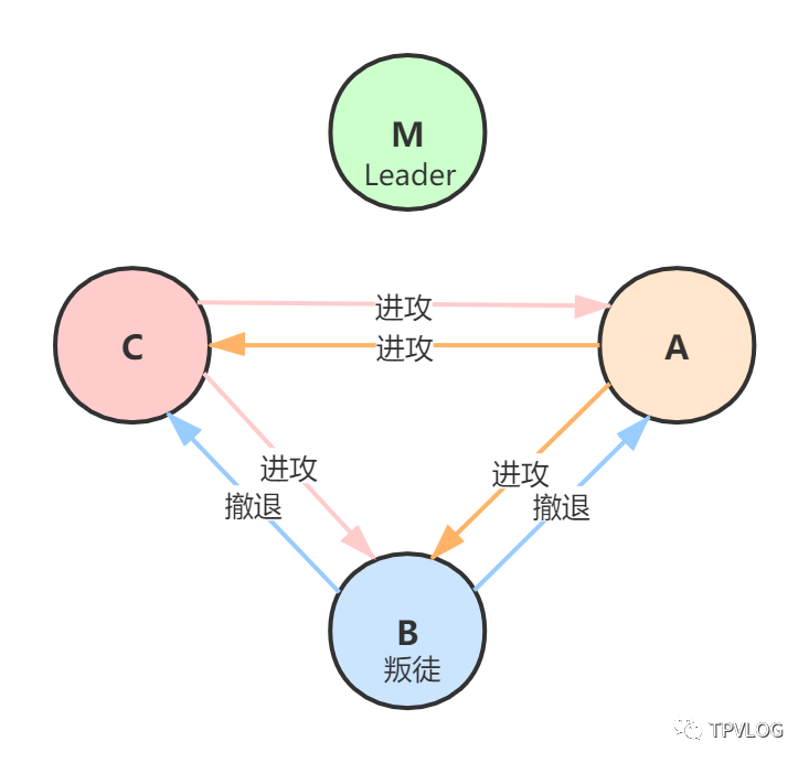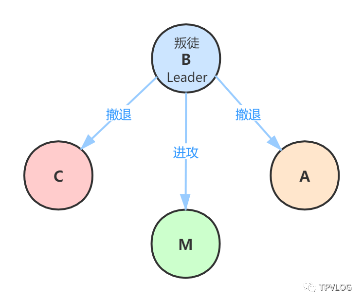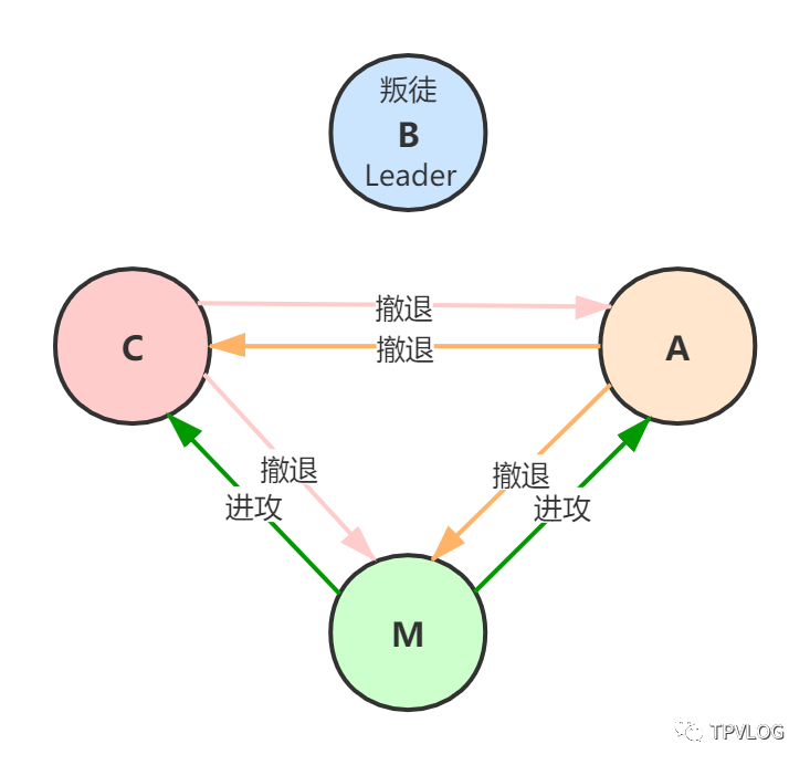 那么按照原则,A、C、M一起执行作战指令“撤退”, 实现了作战计划的一致性。也就是说,无论叛将B如何捣乱,A、C、M都执行一致的作战计划,保证作战的胜利 。