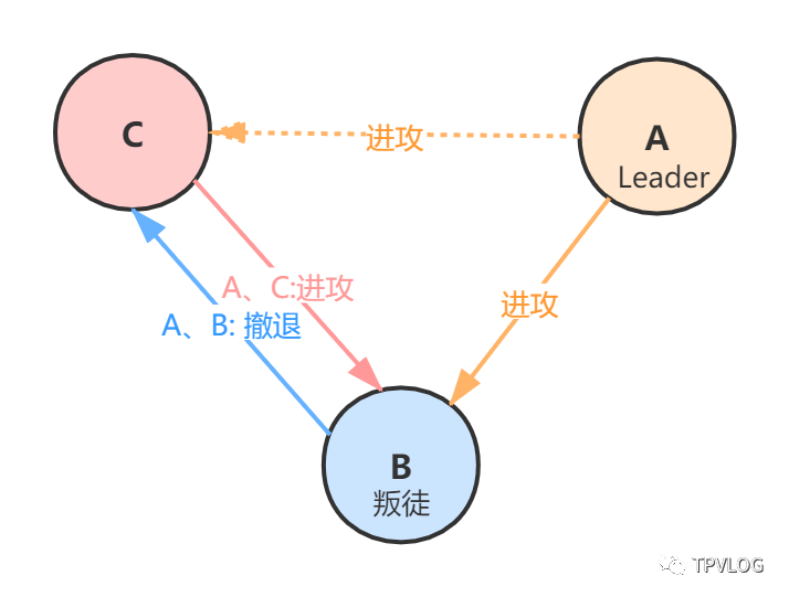 举个例子,如果忠诚将军A先发起“进攻”指令,那么他就作为指挥官Leader, 一旦叛将B修改或伪造收到的作战信息,那么C在接收到B的作战信息时,会发现A的作战信息被修改,就认为B已叛变,此时将忽略来自B的作战信息,最终执行A发送的作战信息: