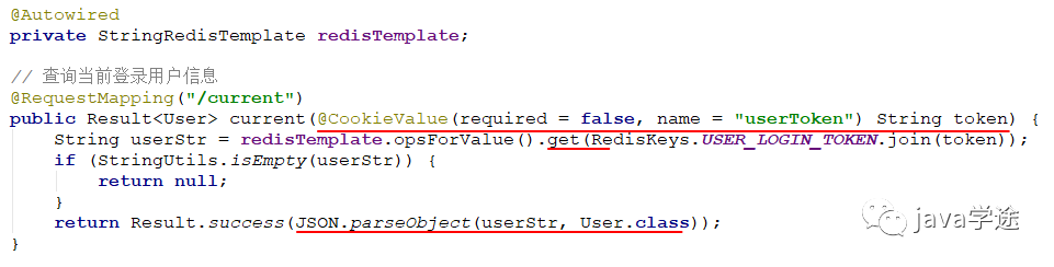 使用了前台传过来的token去Redis中查询了登陆过的用户信息。