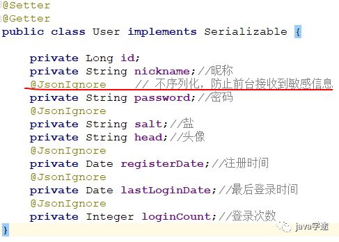 响应回来的信息不能把密码等敏感信息返回:不让他序列化,就不会再网络中进行传输了。