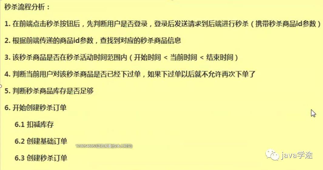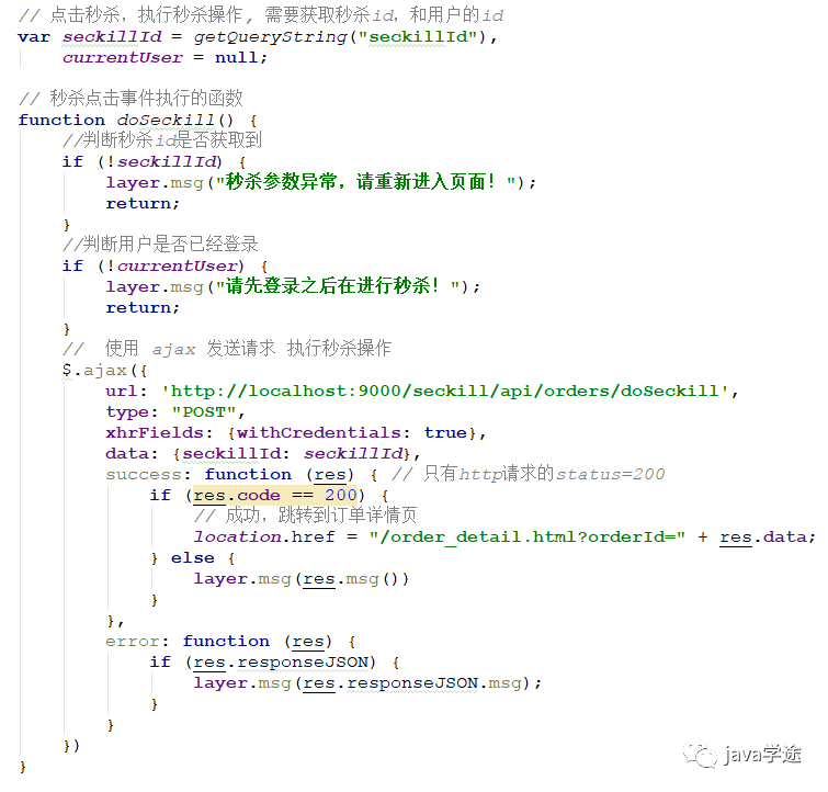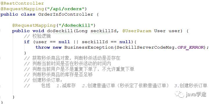 @RestController@RequestMapping("/api/orders")public class OrderInfoController {@Autowiredprivate ISeckillGoodService seckillGoodService;@Autowiredprivate ISeckillOrderService seckillOrderService;@Autowiredprivate IOrderInfoService orderInfoService;@RequestMapping("/doSeckill")public Result<String> doSeckill(Long seckillId, @UserParam User user) {// 校验逻辑if (user == null || seckillId == null) {throw new BusinessException(SeckillServerCodeMsg.OPS_ERROR);}// 1. 获取秒杀商品对象,判断秒杀活动是否存在SeckillGoodVO seckillGoodVO = seckillGoodService.findById(seckillId);if (seckillGoodVO == null) {throw new BusinessException(SeckillServerCodeMsg.OPS_ERROR);}// 2. 判断当前时间是否在秒杀活动的时间内Date now = new Date(); // 当前时间// 当前小于开始时间,活动未开始if (now.compareTo(seckillGoodVO.getStartDate()) < 0) {throw new BusinessException(SeckillServerCodeMsg.NOT_START_ERROR);}// 当前大于等于结束时间,活动已结束if (now.compareTo(seckillGoodVO.getEndDate()) >= 0) {throw new BusinessException(SeckillServerCodeMsg.ALREADY_OVER_ERROR);}// 3. 判断当前用户是不是重复下单了,不允许重复下单SeckillOrder seckillOrder = seckillOrderService.findBySeckillIdAndUserId(seckillId, user.getId());if (seckillOrder != null) {throw new BusinessException(SeckillServerCodeMsg.ALREADY_AGEIN_ERROR);}// 4. 判断秒杀商品的库存是否足够if (seckillGoodVO.getStockCount() <= 0){throw new BusinessException(SeckillServerCodeMsg.STOCKCOUNT_OVER_ERROR);}// 5. 创建秒杀订单:// 包括 1.减库存 2.创建普通订单(秒杀订单依赖普通订单) 3.创建秒杀订单String orderNo = orderInfoService.doSeckill(seckillId, user.getId());return Result.success(orderNo);}}