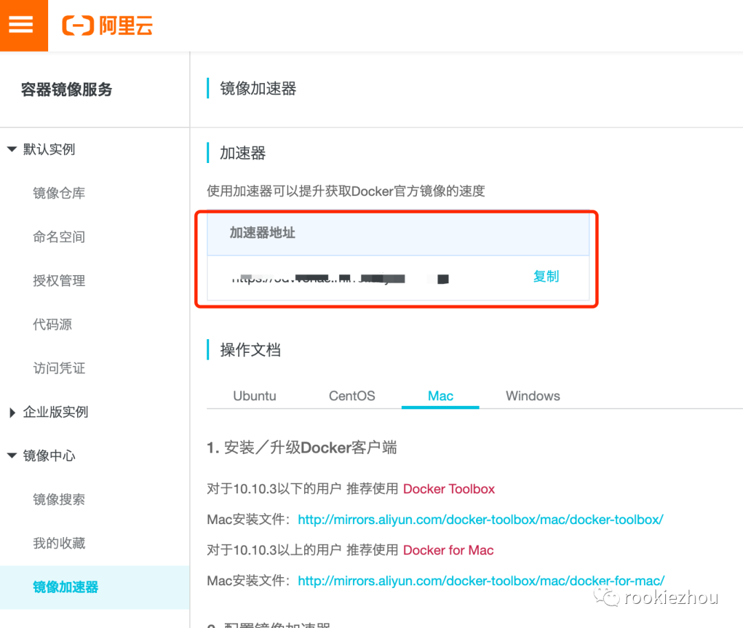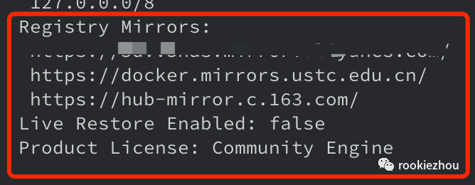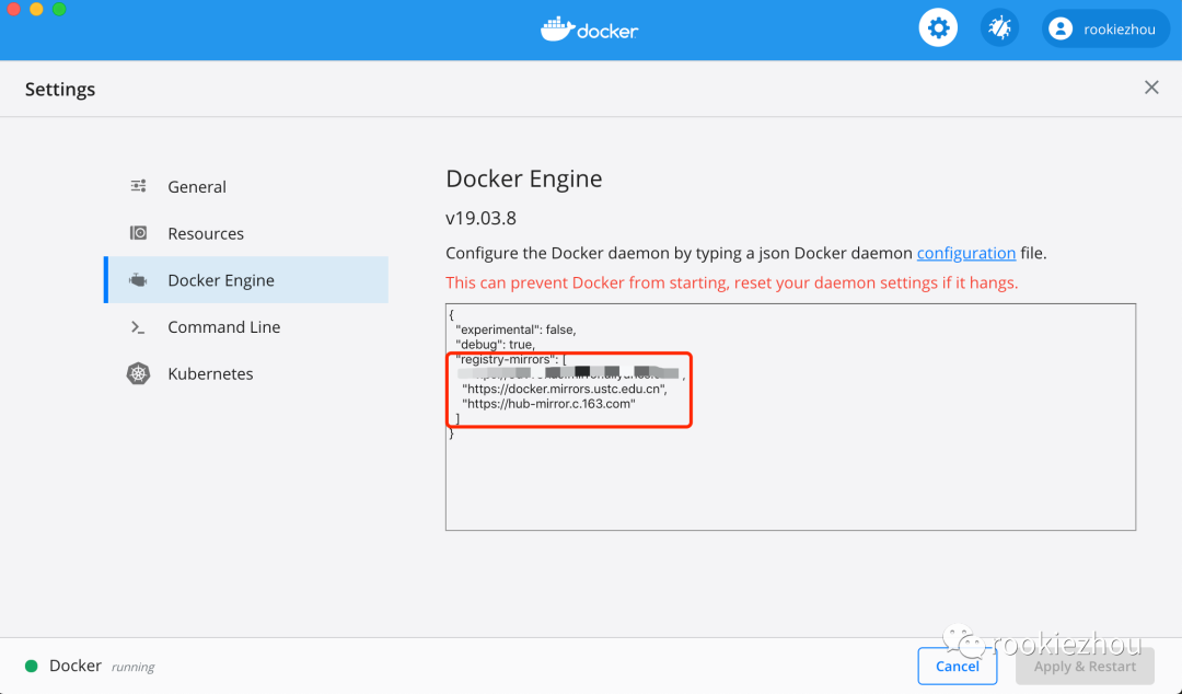 打开 preferences -> Docker Engine, 在右边配置框里面加上国内镜像源的配置,然后 Apply & Restart ,待重启完毕后,可以执行下面的 docker info 命令验证是否添加成功:上面的第一行是我在阿里云里面申请的一个镜像地址,这个自己注册了阿里云账号的话也可以去申请一个,后面两个分别是国内的科大和网易的镜像源:1https://docker.mirrors.ustc.edu.cn/