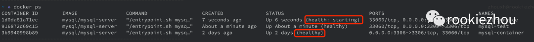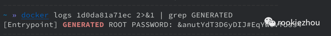 执行完命令之后,如果执行成功应该会有很长一串的 ID 打印出来,这是启动的容器 ID,后期可以通过这个 ID 来对容器执行启动,停止,重启,删除,查看日志,进入容器等一些列操作。我们可以通过 docker ps 命令来查看本地正在运行的容器:可以看到 STATUS 那一栏,health 状态处于 starting 状态,待状态变成 healthy 之后,说明容器启动完成,接下来就可以使用了,不过我们是不是还不知道 mysql 的 root 连接密码,我们需要通过查看容器的启动日志得到: