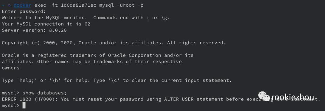 执行命令之后可以看到容器启动的日志中生成了一个密码,不过这个密码只是一个临时的密码,通过这个密码连接到数据库之后,还是需要修改密码之后才能继续操作数据库。1docker exec -it 1d0da81a71ec mysql -uroot -p